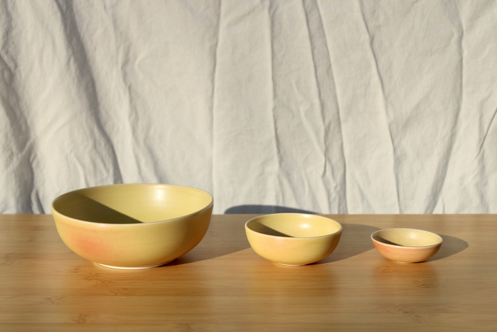 Porcelain + wheel thrown by yours truly! Finished in my toasty Anzu color way, a satin matte glaze that ranges from canary yellow to blood orange.