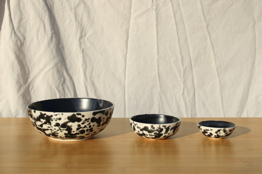 Porcelain + wheel thrown by yours truly! Finished in Meteor, a black and white gloss glaze.